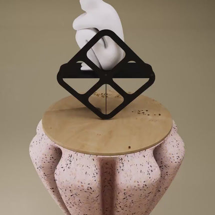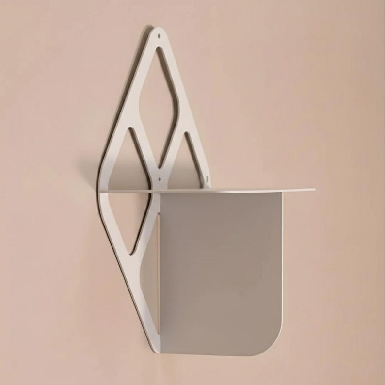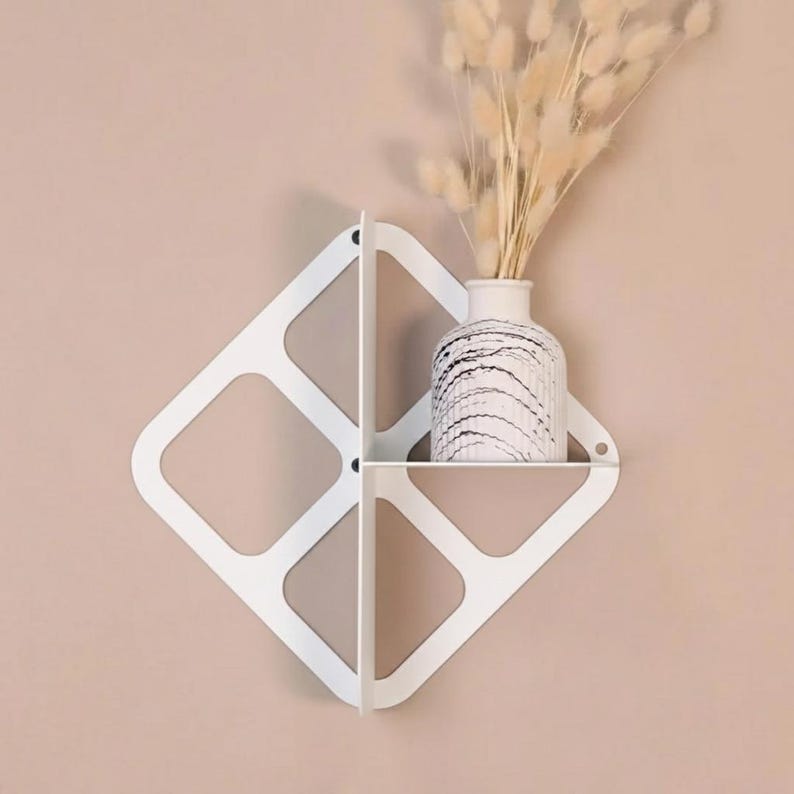 This geometric metal wall shelf combines a sculptural diamond-shaped frame with a compact shelf surface, offering a functional display solution with a strong modern character.