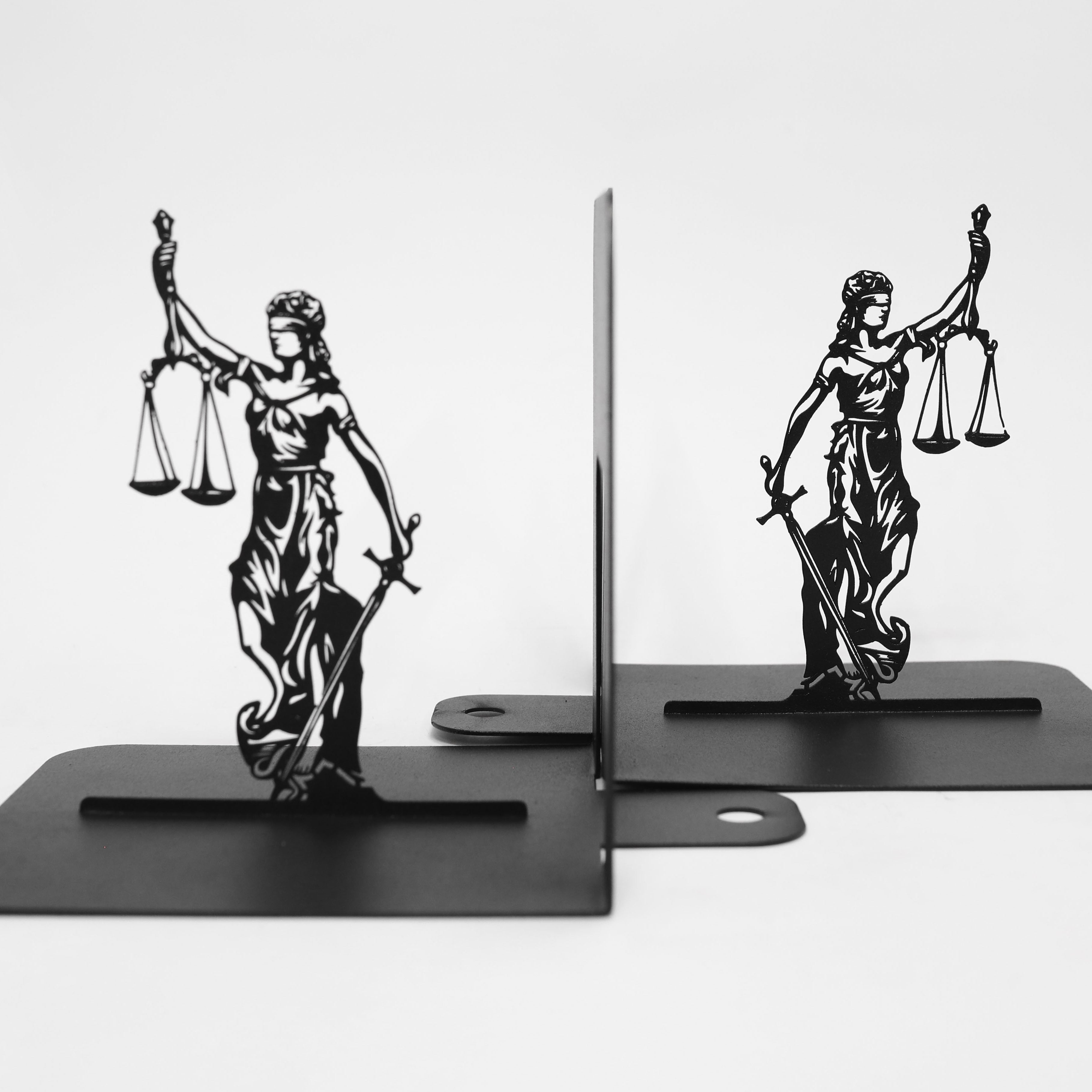 This metal bookend pair features the Lady Justice (Femida) silhouette, combining a symbolic legal motif with a clean, functional form for organized shelving.