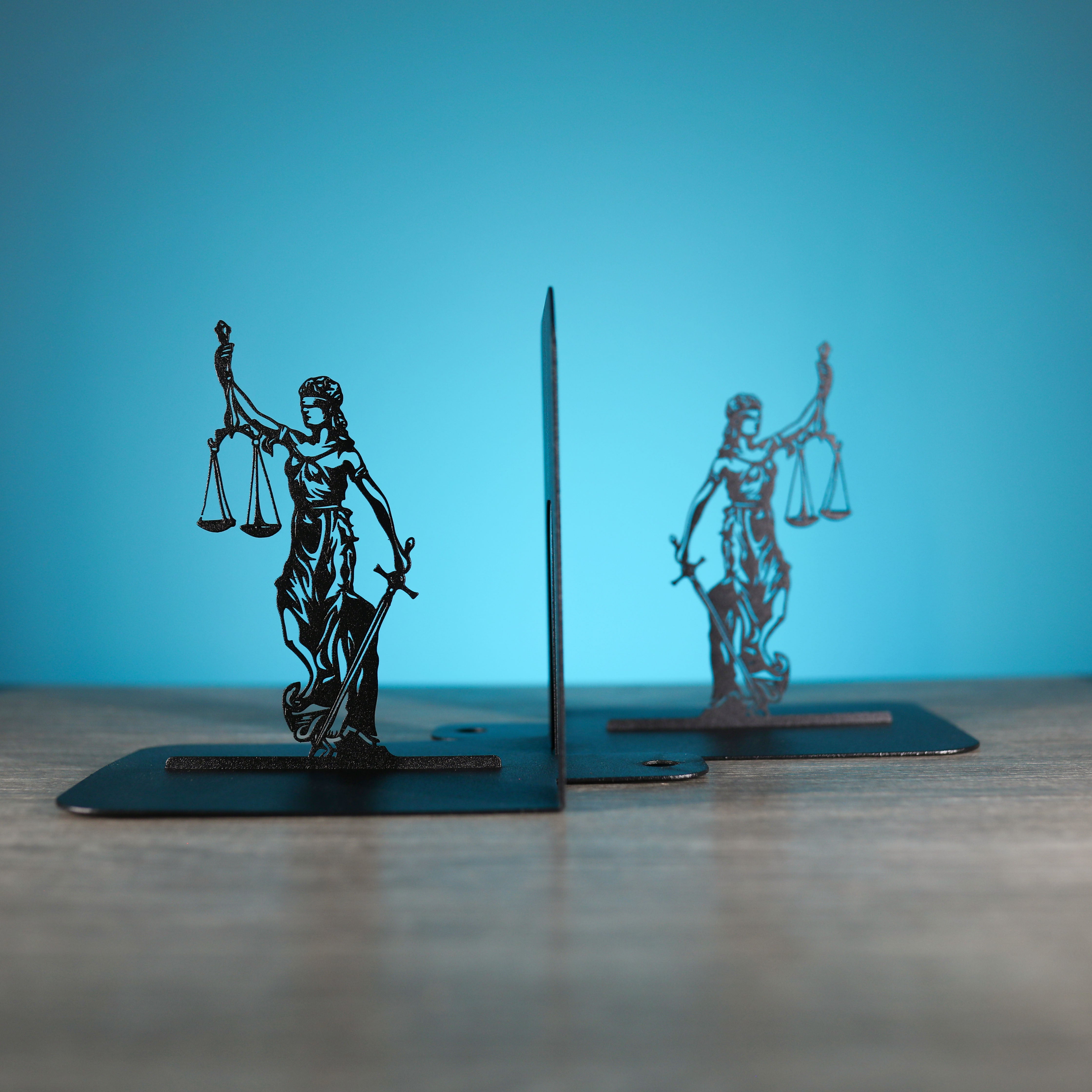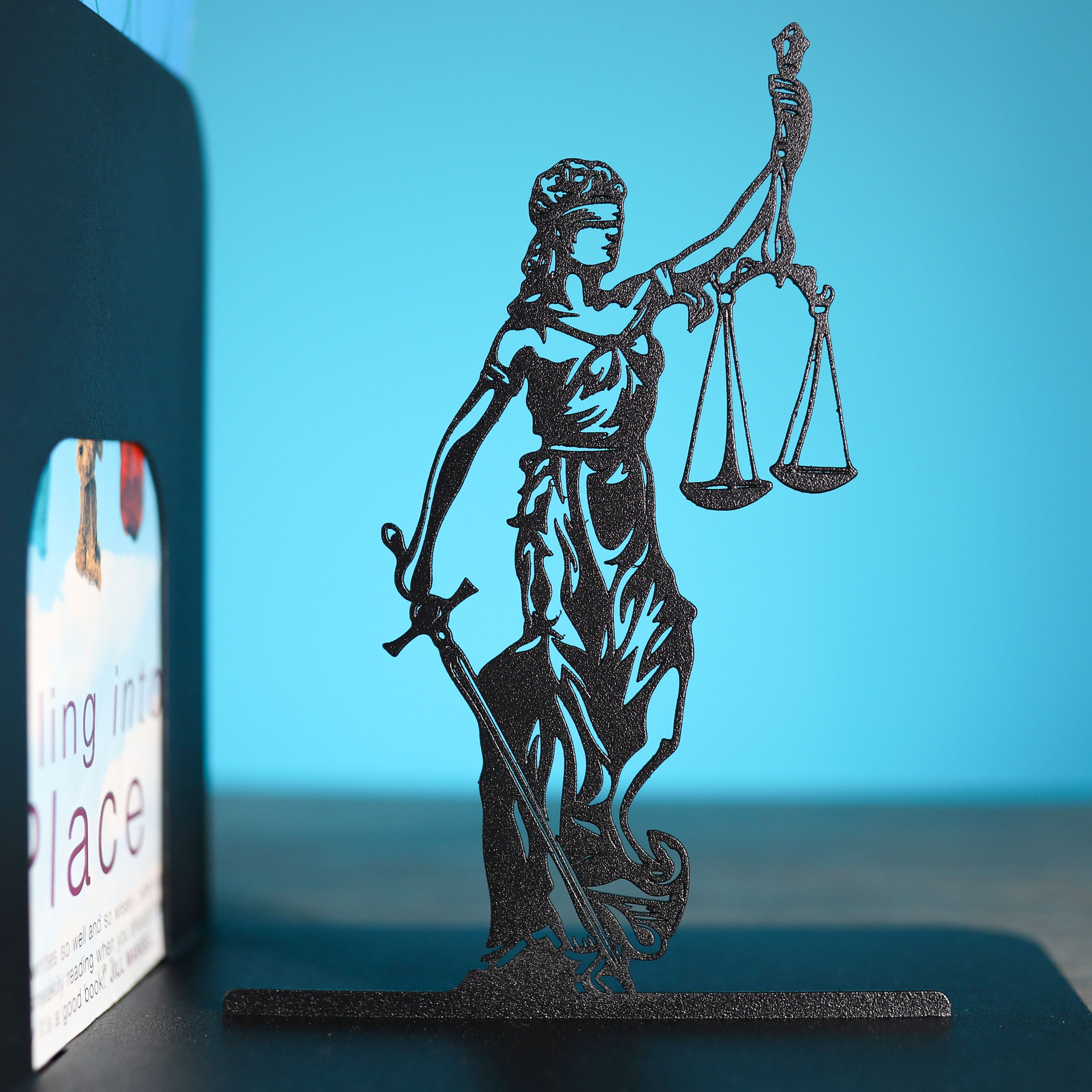 The bookends depict the classical figure of Lady Justice holding scales and a sword, rendered in a detailed yet balanced silhouette. The design carries a strong symbolic presence while remaining visually restrained, making it suitable for modern, professional, and classic interiors.