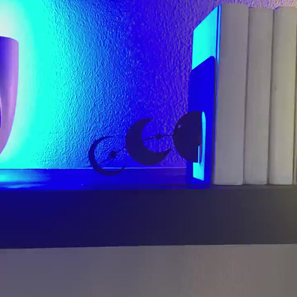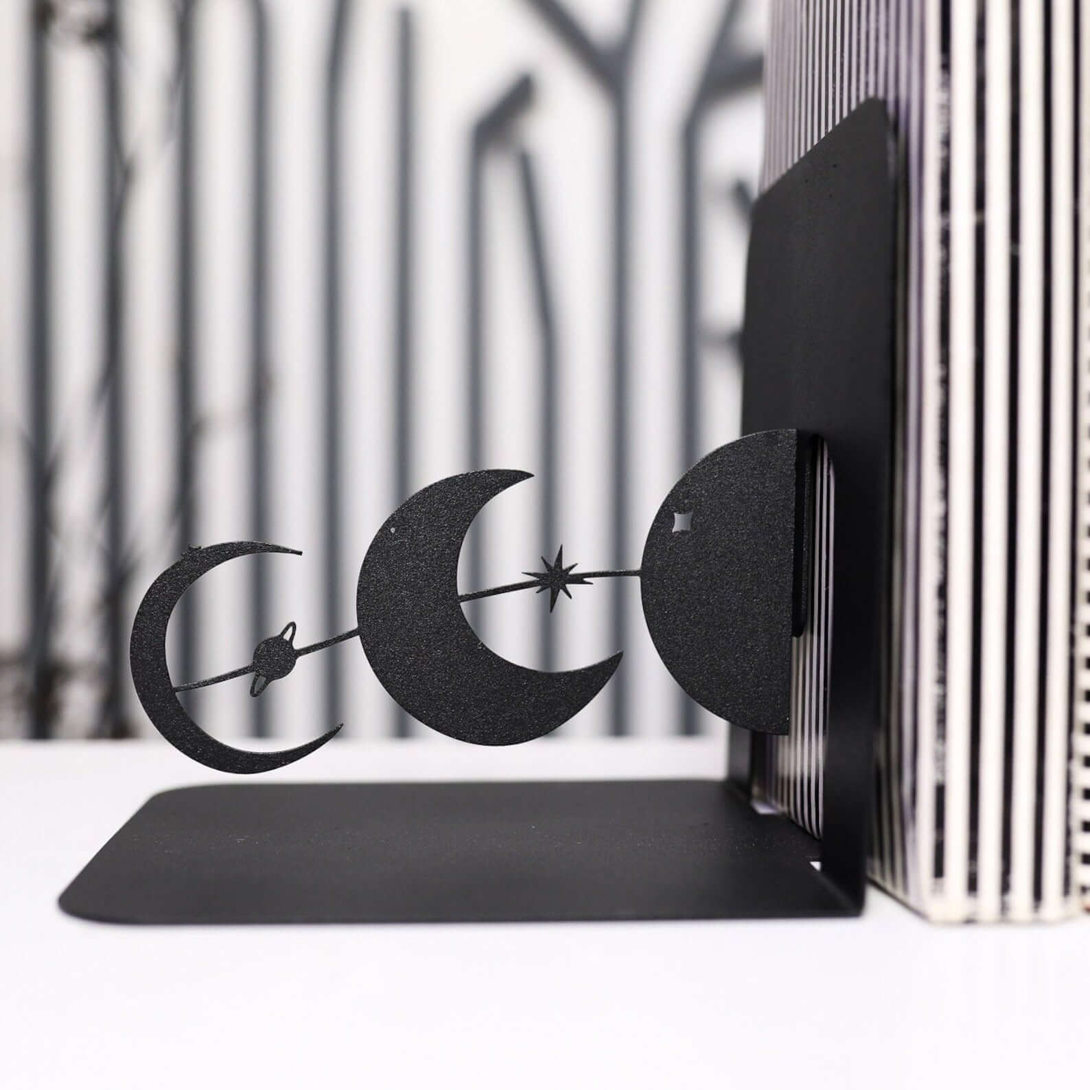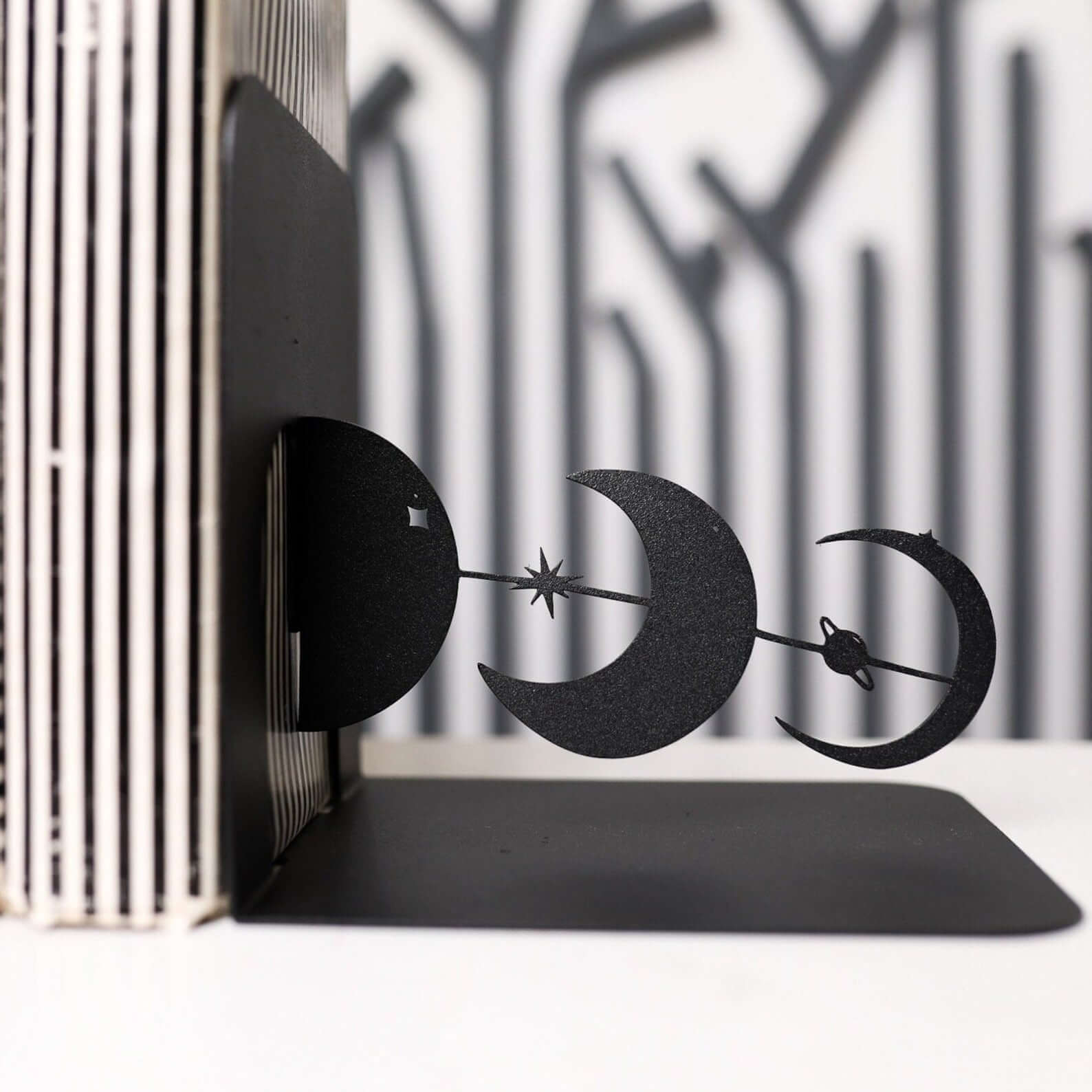 The bookends feature a sequence of moon phases connected by fine linear elements, forming a clean and symmetrical composition. The graphic, cut-out silhouettes suit modern, minimalist, boho, and celestial-inspired interiors, adding subtle visual interest without overpowering the space.
